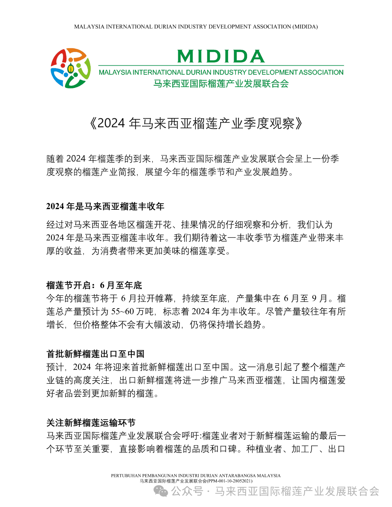 榴莲联合会与中国国际贸易促进委员会的合作,共同实现榴莲的地理标志认证,并积极参与2024年中国国际地理标志品牌合作大会,进一步提升我们的马来西亚猫山王品牌影响力和市场竞争力。共同实现互利共赢的局面。