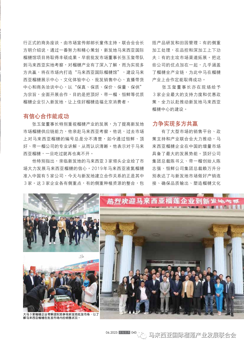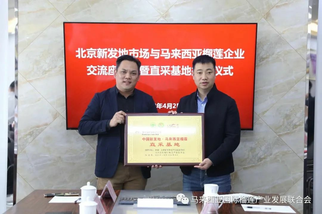 4月2日,由马来西亚国际榴莲产业发展联合会(简称“联合会”)和中国北京新发地市场(简称“新发地”)共同主办的“北京新发地巿场与马来西亚榴莲企业交流座谈会暨直采基地揭牌仪式”与“国际榴莲馆”建设交流会在中国北京成功举行。出席本次会议的嘉宾有联合会会长方明、秘书长张健豪、中国区执行会长叶苹,亚经协中马合作委员会会长拿督赵光明,新发地董事长张玉玺、总经理张月琳、常务副总经理顾兆学、宣传部部长童伟,马来西亚头部榴莲企业顶好水果有限公司总裁陈书义、帝一榴食品有限公司创始人陈志强、恒鲜食品(马)有限公司总裁赖万升,新发地市场马来西亚榴莲经销商代表管丽华、刘运田、吴勤、毛勇习、刘红伟出席座谈会。会上,联合会会长方明表示,通过各方共同努力和精心策划,新发地国际榴莲馆项目取得了丰硕的成果,达成诸多共识。新发地董事长张玉玺曾带队到马来西亚实地考察,对榴莲产业有了深入的了解,为实现多方共赢,双方决定在新发地市场打造“国际榴莲馆”,建设榴莲展示中心、文化体验中心、批发销售中心、直播带货中心和商务洽谈中心,以“保真、保质、保价、保量、保供”为宗旨,全面系统开展合作,核心目的是把顶好、帝一榴、恒鲜等优质榴莲企业引入新发地,让好榴莲造“福”中国消费者,造“富”马来西亚人民。