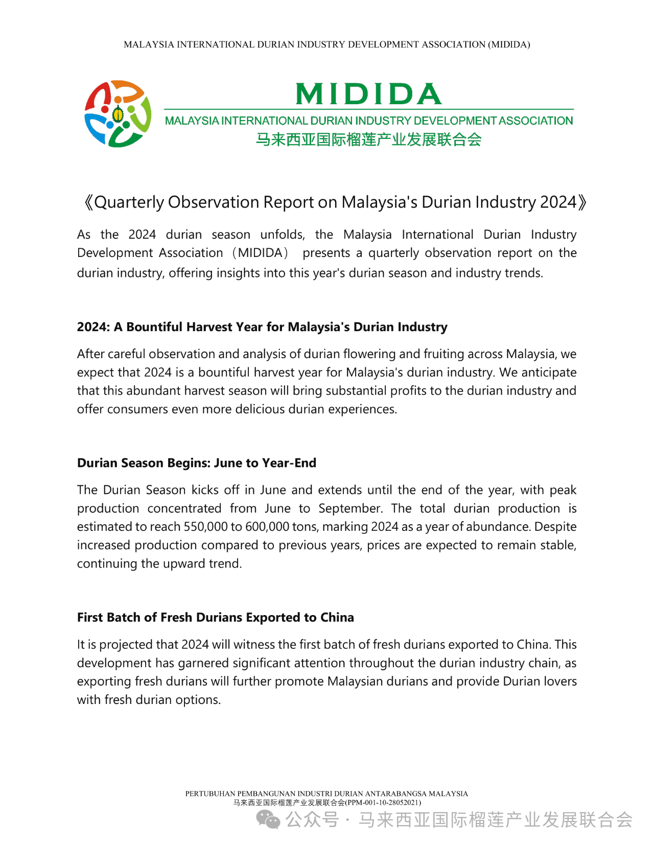 他说,该联合会也计划与战略合作伙伴,一起制作一部纪录片,记录大马的榴梿历史和目前的种植情况,以完整记录这方面的资讯,让更多消费者从中了解大马的榴梿出产过程。